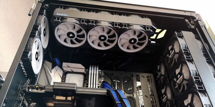 Dopo qualche giorno, abbiamo tutti i pezzi con noi. Ora dobbiamo rimuovere nuovamente la scheda madre AMD, preparare la scheda madre Intel con CPU, dissipatore e RAM e installarla. Poi installiamo il radiatore nella parte superiore insieme alle ventole. A proposito di ventole: ce ne sono 24. Ogni ventola ha due cavi: uno per l'hub RGB e uno per il controller. I cavi sono quindi 48. Anche in questo caso abbiamo dimenticato qualcosa nella progettazione. Si tratta degli hub RGB. Questi devono essere collegati con un altro cavo.
