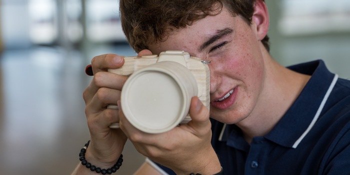 Le fotocamere e gli obiettivi sono leggeri. Sono costituite da molti pannelli di compensato incollati tra loro, che conferiscono al modello il suo disegno a linee sottili. Jonas ha tagliato il legno con un seghetto alternativo e l'ha levigato a mano.