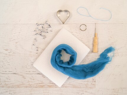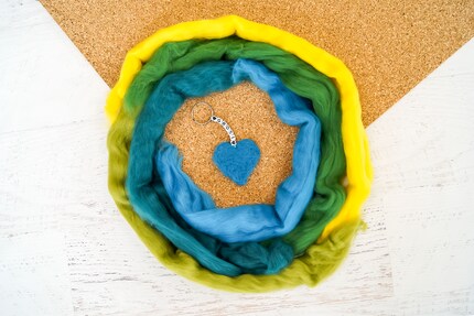 Visualizza tuttiPer il ciondolo di feltro, hai bisogno di lana da fondere, un un cuscinetto di schiuma e un Ago da infeltrimento con supporto. La mia arma segreta è il Guezliförmli. Per la catena, avrai bisogno di un cordoncino di seta, qualche perline e un anello a chiave.
