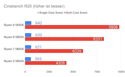 Ho discusso in dettaglio i risultati dei modelli 5950X, 5900X e 5600X negli articoli linkati sopra. Lì li confronto con i modelli precedenti e con la concorrenza di Intel. Anche il processore più piccolo, il Ryzen 5 5600X, è in grado di tenere il passo con l'Intel i9-10900K. Il salto di prestazioni è enorme, soprattutto per quanto riguarda le prestazioni in single-thread. Ma la differenza è del 20 percento o più anche nei processi multi-thread.