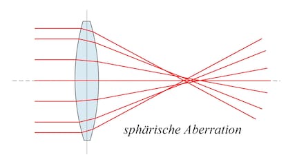 L'aberrazione sferica è un errore di riproduzione nelle lenti ottiche e quindi anche negli obiettivi fotografici. A causa della curvatura della lente, i raggi luminosi non vengono reindirizzati correttamente sul bordo. Teoricamente nello schema sottostante tutti i raggi dovrebbero incrociarsi nello stesso punto – ma non succede. In questo modo l'immagine risulta meno nitida ai bordi, almeno quando il diaframma è aperto.