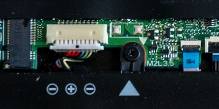 Prima di avvitare, dai un'occhiata a come sono disposti i cavi. Quello che cerchi è un connettore che collega la batteria alla scheda madre. Tieni d’occhio anche i cavi a lato della batteria, che potrebbero strapparsi durante la rimozione. In genere, dovresti riuscire a spostarli da parte abbastanza facilmente.