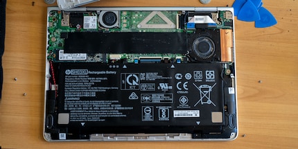 Allenta delicatamente il connettore con uno strumento Pry Tool o un paio di pinzette. Se sei molto abile, puoi farlo anche con le dita. Poi devi estrarre le quattro viti e iniziare attentamente a sollevare la batteria con il Jimmy o il Pry Tool. La batteria potrebbe essere ancora attaccata. Questo non è il caso del mio HP Spectre, perché la batteria si solleva dopo circa due secondi.