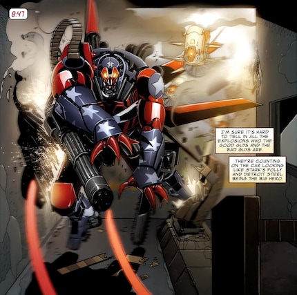 L'unico personaggio della Stark Industries nei fumetti a essere nero/rosso o nero/rosso o nero/blu scuro è un'armatura chiamata Detroit Steel, ma è un cattivo. Ed è anche brutto. Ma, dato che la Kona non è così brutta, non credo si sia ispirata a Detroit Steel.