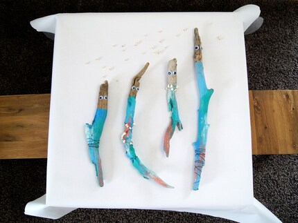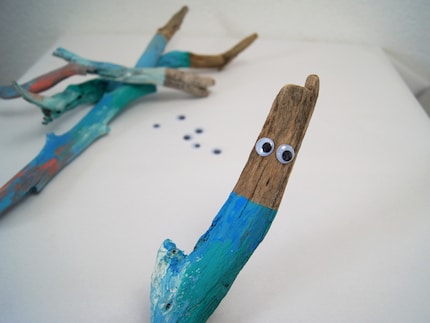 Oltre ai legni di scarto, puoi utilizzare qualsiasi cosa ti piaccia per la decorazione. Se dipingere il legno con un pennello o usare la colla per attaccare altri elementi decorativi dipende esclusivamente dalla tua creatività e da quella dei tuoi figli. Per decorare il mio ritratto di famiglia ho utilizzato i seguenti materiali: Occhietti, nastro adesivo, vernice artigianale, filo di ferro e perline.