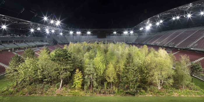 Lo stadio Wörthersee di Klagenfurt, in Austria, è stato costruito appositamente per gli Europei di calcio del 2008. Può contenere 30.000 spettatori, una capacità ottima per gli Europei, ma un po' sovradimensionata per il club di seconda divisione SK Austria Klagenfurt. Ecco perché ora ci sono degli alberi al posto dei calciatori.