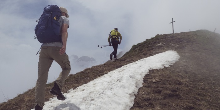 Sento un brivido correre lungo la schiena. Ma non ha nulla a che fare con il mio zaino. Sono in piedi sul precipizio, che non riesco a vedere perché è pieno di nebbia. E improvvisamente mi rendo conto che non c'è né una rete né un falso fondo. Durante la mia escursione con l'avventuriero Ruedi Gamper, io raggiungo i miei limiti, lui fa facilmente un passo in più.