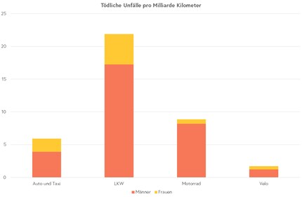 Il mezzo di trasporto che causa il minor numero di vittime sulle strade è la bicicletta. In media, muore solo una persona ogni miliardo di chilometri. Tuttavia, c'è anche una significativa differenza di genere in sella. In media, gli uomini in bicicletta causano 1,24 incidenti mortali per miliardo di chilometri, mentre le donne ne causano meno della metà, 0,48.