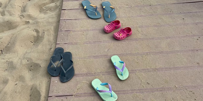 Due paia di scarpe a persona – scarpe da ginnastica e infradito – sono d'obbligo, anche durante le vacanze estive. A seconda delle dimensioni della famiglia, si crea una vera e propria macedonia di scarpe accanto alla porta dell'alloggio. Una cassa è sufficiente per tenere le scarpe in ordine: basta metterle tutte dentro. L'abbiamo copiato dai nostri vicini di campeggio e da allora abbiamo sempre con noi una cassa pieghevole.