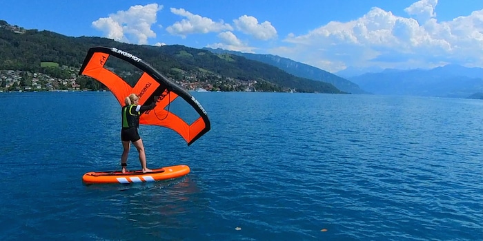 Ci sono cose che mi emozionano incredibilmente. Il wingfoiling, cioè «volare» sulla superficie d'acqua su una tavola con una vela, è una di queste. Allo stesso tempo, la voce della ragione mi dice che ci vorrà una vita prima che io possa impararlo. Inoltre, è necessario un vento forte che soffia costantemente in una direzione, condizioni che in Svizzera si verificano raramente. Finora, la voce della ragione ha sempre trionfato.