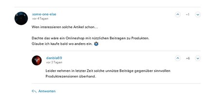 Visualizza tuttiRecentemente c'è stato un po' di fermento nella Community di Galaxus. Cos’è successo? Il mio collega Martin Rupf ha svelato in un articolo di essere un padre «anarchico» che fa a meno del casco quando va in giro in bicicletta con i suoi figli. Un cattivo esempio per i suoi figli, secondo Katja Fischer, che gli ha risposto a tono con un post. E tutto ciò, a sua volta, ha fatto arrabbiare alcuni dei nostri lettori. Dopotutto, Galaxus è un rivenditore online che dovrebbe limitarsi a vendere prodotti, ha commentato qualche utente, come nel seguente post: